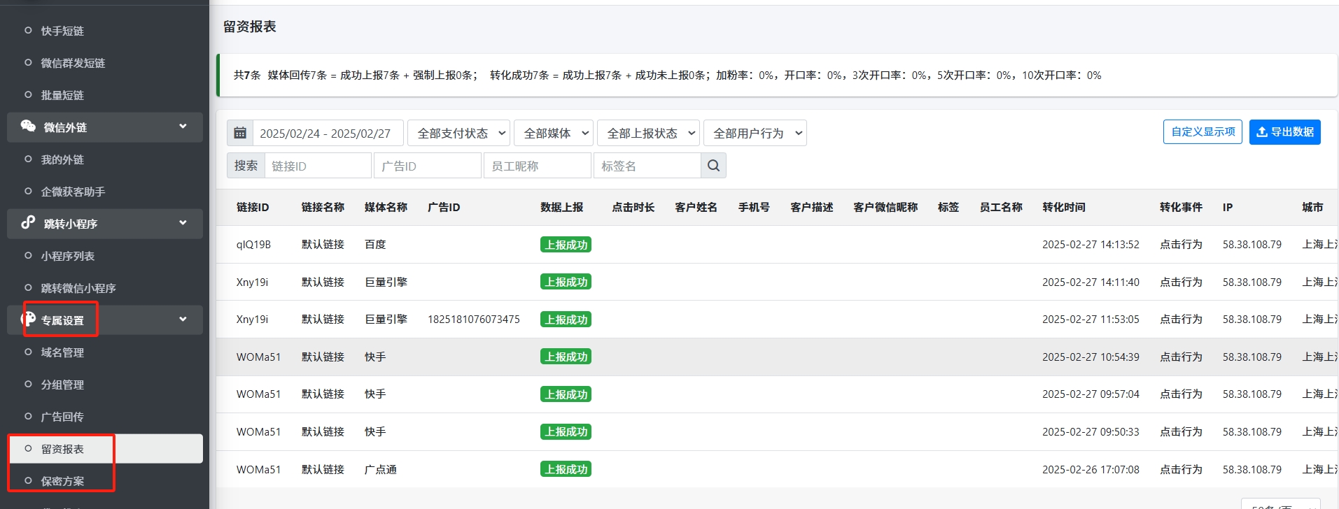 1.到管理后台,在【专属设置】-【留资报表】中可以查看广告投放的效果