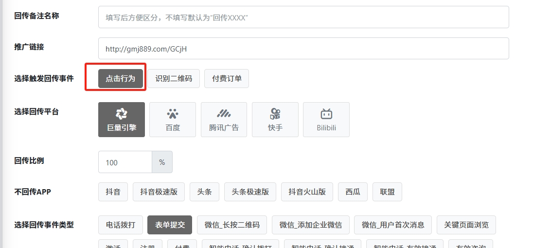 这个回传主要是落地页按钮点击,如果没有落地页则是打开外链就回传
