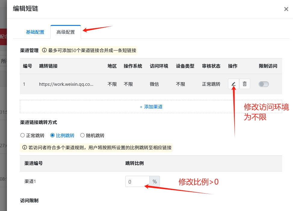 - 解决方案:在短链的高级设置里,修改跳转的条件,使得跳转满足条件