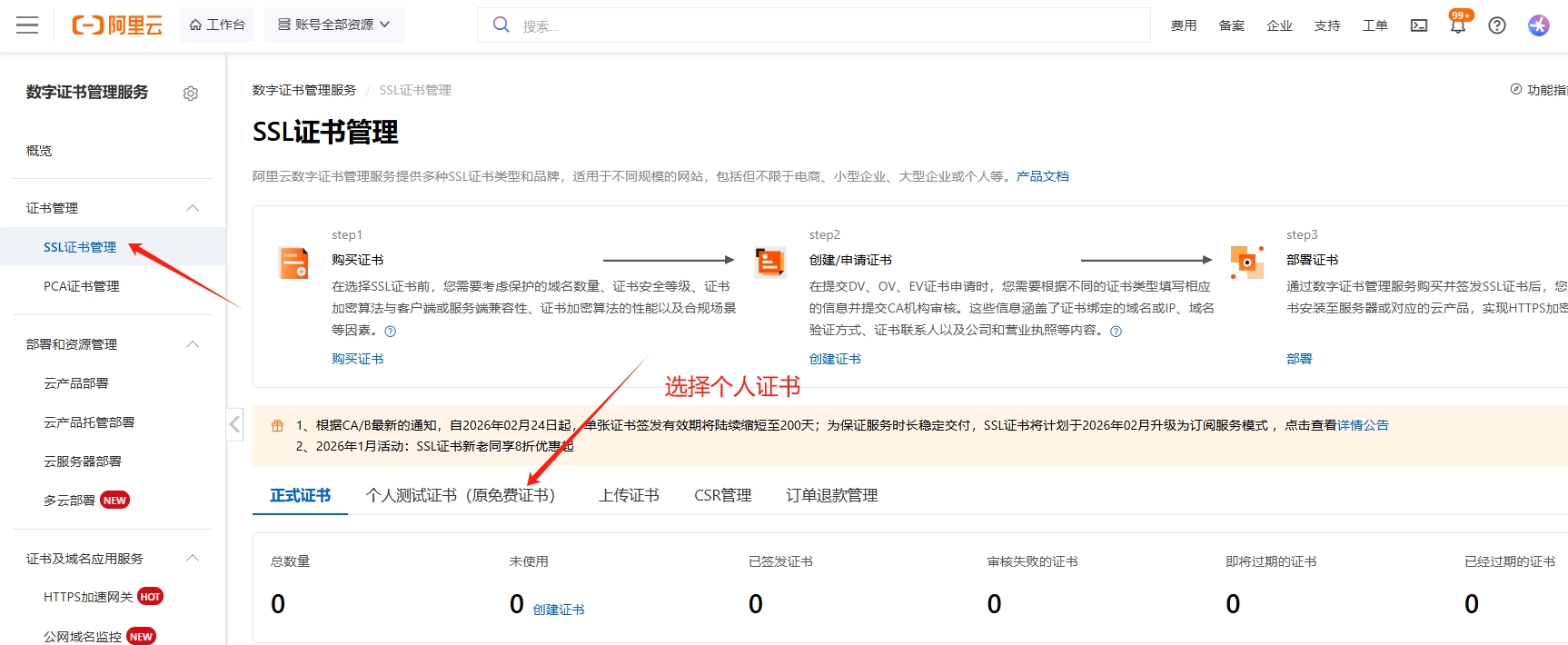 到阿里云官网首页,输入SSL,选择【数字证书管理】,然后登录控制台