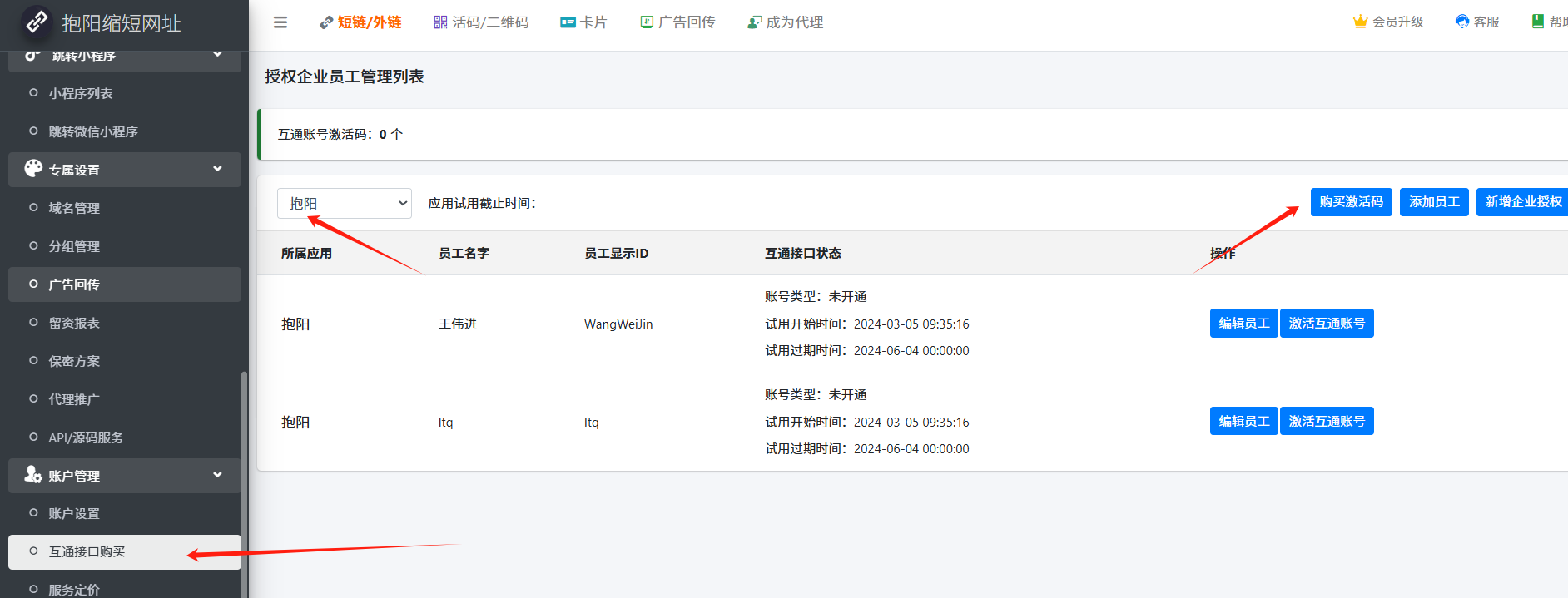 - 解决办法:【账号设置】-【互通接口购买】,根据自己需要购买企微的互通接口数量。