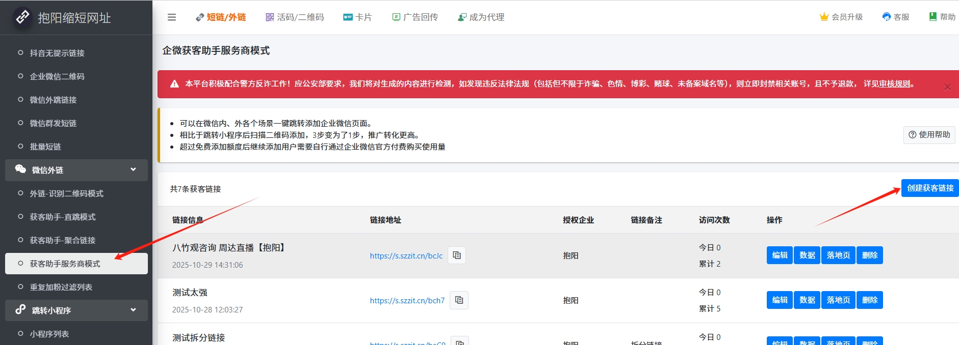 - 点击页面中【创建获客链接】