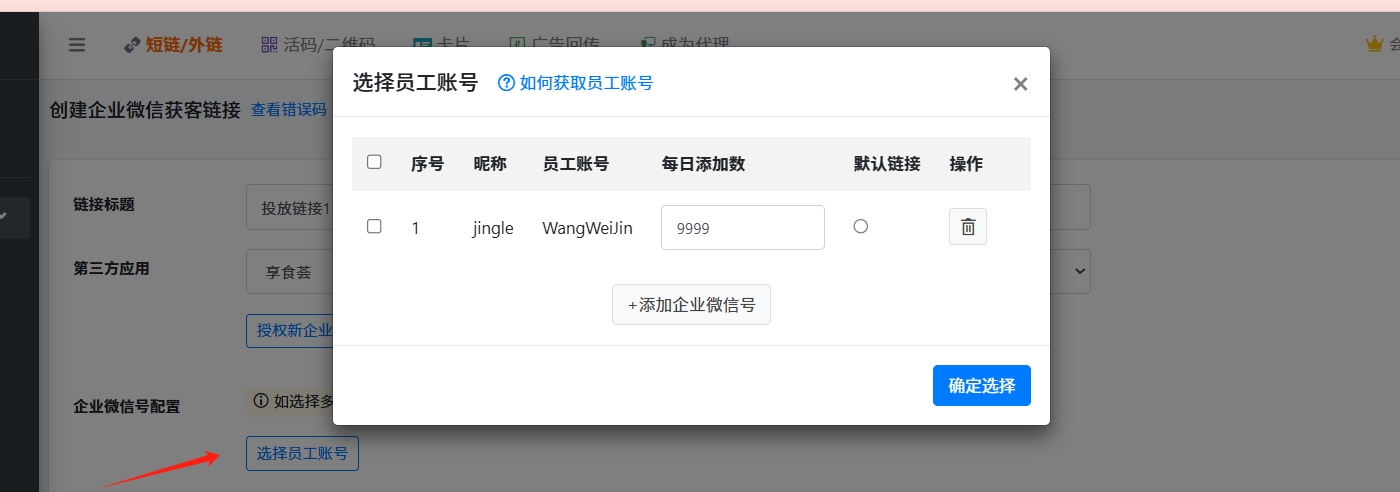 - 选择获客链接的员工,可以设置每个员工的加粉限额。【默认链接】--表示此员工为兜底员工,全部员工加粉都超过限额后,使用此员工为加粉;每个员工按设置的加粉限额,轮流加粉。